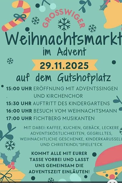 | Samstag, 29.11.2025 | Großwiger Adventsmarkt | Gutshaus in Großwig | |